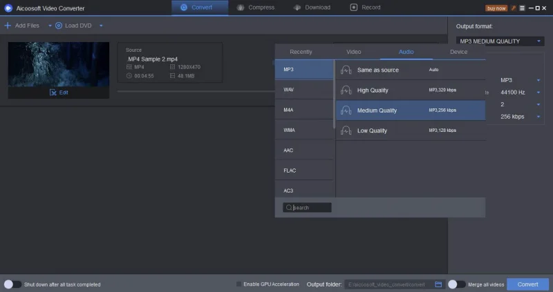 The selected mp4 videos which are to be converted will be uploaded in the Aicoosoft video converter. The next step is to click on the ‘output format’ option on the right hand side and select the MP3 format from Audio tab.