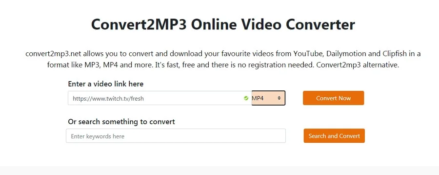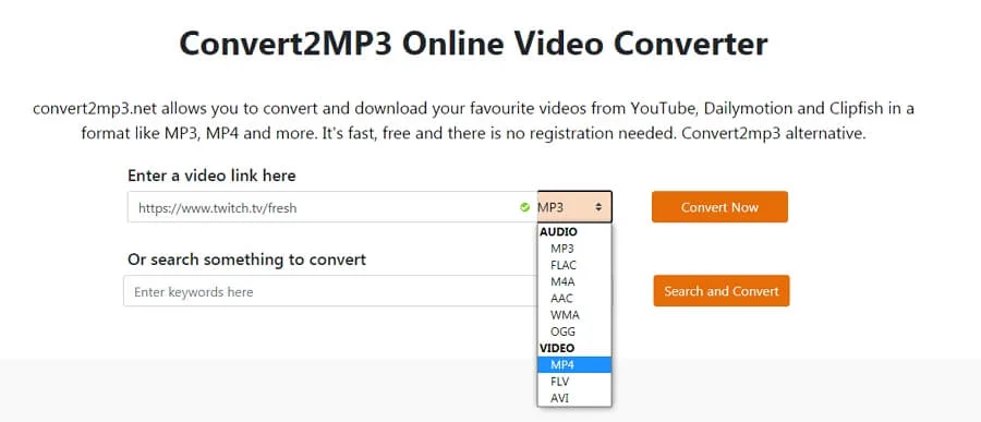 Online videos work best when video download is required occasionally and without any advanced options. Since these programs work straight from your browser, you do not have to get into the hassle of software download or installation. One such decent tool that you can use to download twitch videos is convert2mp3. With a simple interface, the program allows video download in decent quality from Twitch and other popular sites. Supported video formats include MP4, AVI, and FLV along with audio formats. Using the video related keywords, you can even search the desired video on the program interface.