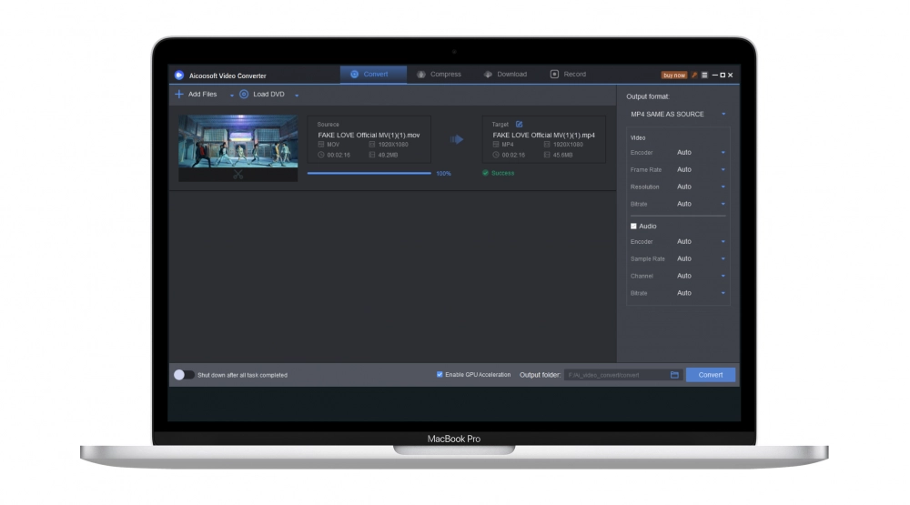 With advanced GPU acceleration technology, Aicoosoft Video Converter empowers the video conversion with lightning-fast speed.