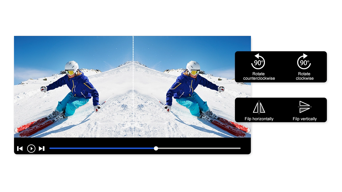 Rotate and flip videos just with one click. You can save your videos in the original format without any quality loss.
