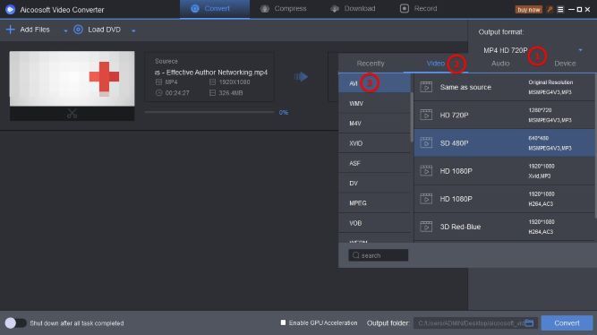 Once the Video has been added to the computer, click on the drop-down arrow, next to “Output format” to select the output format (in this case AVI). Here, you can also choose the resolution you would like to convert the video to.