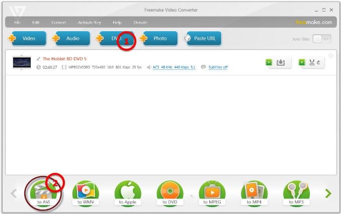 Open the program and then click on the “+DVD” button at the top to add the DVD to the program for conversion. Select “AVI” as the format you want to convert the DVD to.