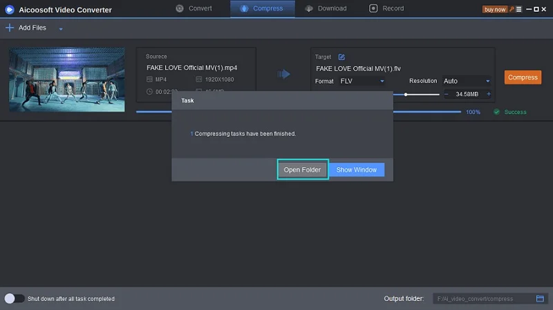 Once the compressing process gets over, you can find the resultant file by clicking the “Open Folder” button.
