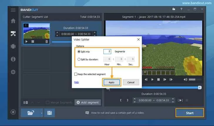 You can use its video splitter (MP4 Splitter) after downloading the free version of Bandicut. You can further select the segments and choose the modes to confirm video splitting.