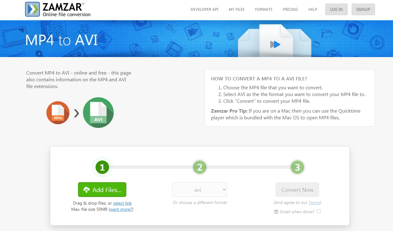 Zamzar converted more than 510 million files since 2006 and hence is the No.1 online tool preferred by many. Zamzar is a 100% free and safe web-based video converter MP4 that requires no registration. The task is so simple where all you have to do is, enter the URL, https://www.zamzar.com/convert/mp4-to-avi/ in the browser, add the MP4 files by clicking on the “Add Files” option, and once loaded, hit the “Convert Now” option.