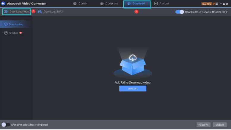 Install and run the Aicoosoft software on your system and select the Download tab from the main interface. Next, click on the Download Video button at the top-left corner.