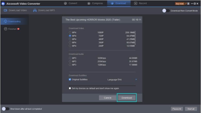 The software will paste and analyze the copied link and a pop-up window will open. Select the format and quality. Click on the Download button for the program to start with the process.