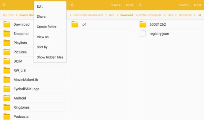 Step 1. On your Android phone having the file manager app go to: Device Storage > Android > data > com.netflix.mediaclient > files > Download > .of.