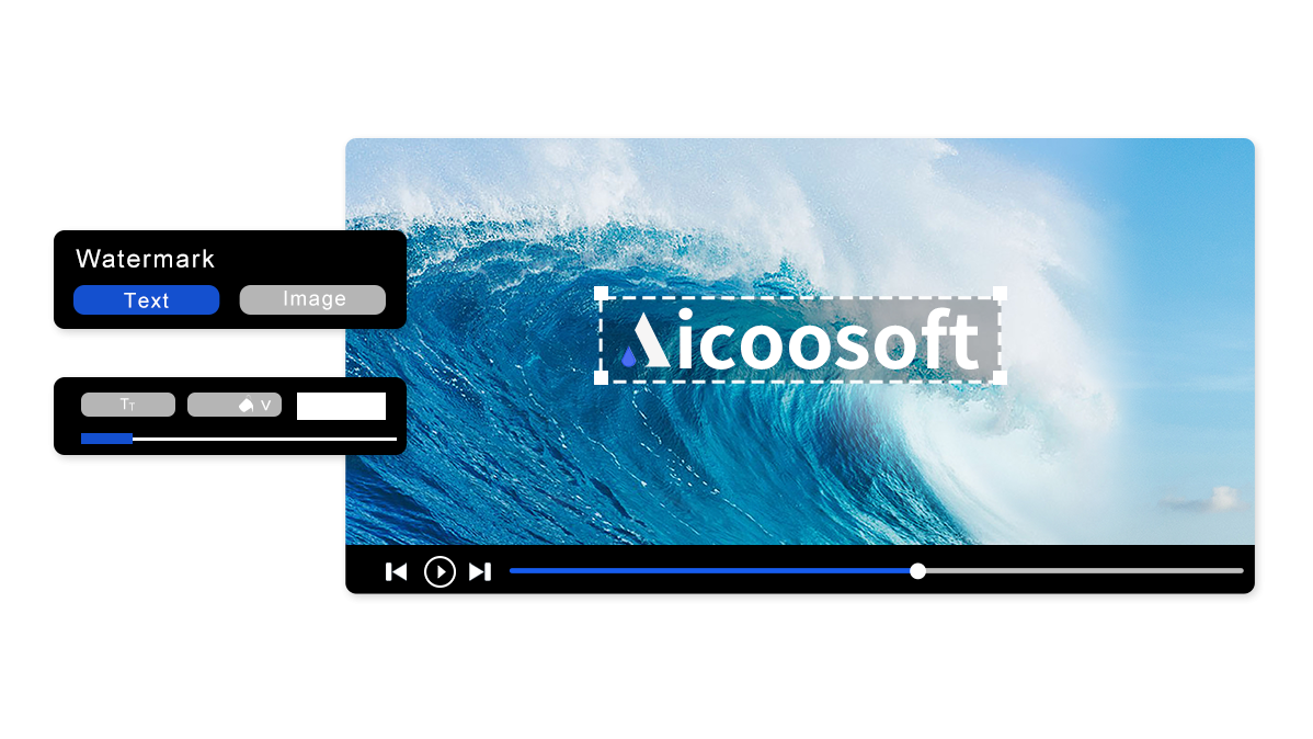 簡単に透かしとしてテキストを追加し、フォント、色、サイズ、回転や透かしの位置を調整するためにサポートしています。